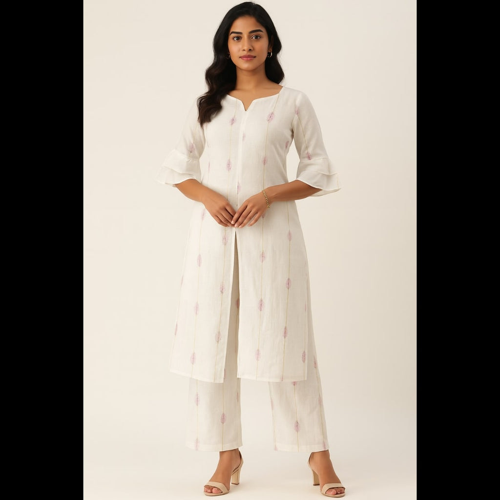 Embrace subtle elegance with the Serene Blossom Co-ord Set. This graceful outfit features a soft off-white base adorned with delicate pastel motifs, lending a light and airy feel. The kurta showcases a stylish notch neckline and layered bell sleeves, paired with matching straight-leg pants for a polished look. Ideal for daytime events or casual gatherings, this set is a perfect blend of comfort and sophistication.
