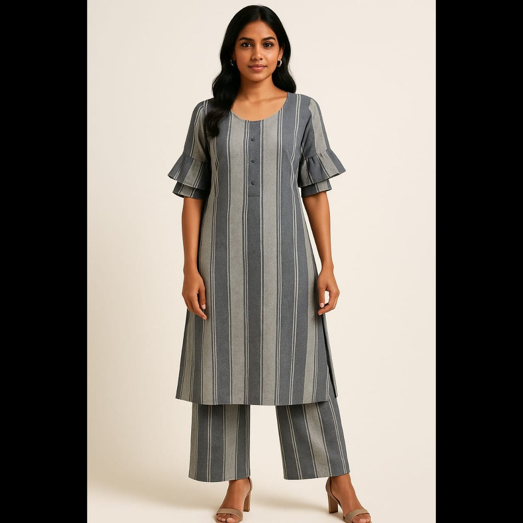 Effortlessly refined, the Slate Breeze Co-ord Set features vertical pinstripes on soft cotton in deep grey tones. The kurta’s ruffle sleeves add a soft, feminine flair to its structured silhouette, while the round neckline and button-down front keep it classic. Paired with easy, wide-leg palazzos, it’s an ideal pick for workdays that stretch into evenings. Style it with neutral heels and minimal jewelry for a crisp, understated look.