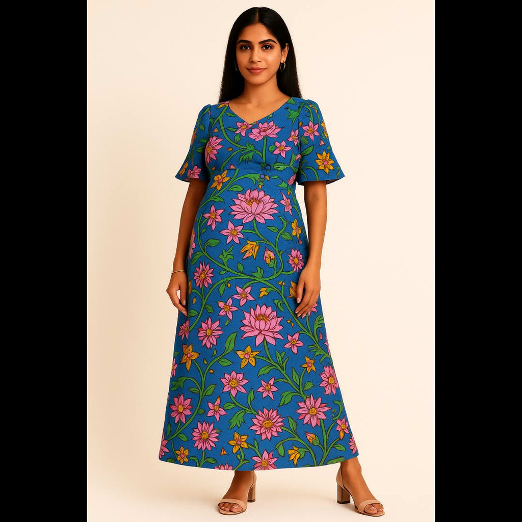 Drenched in rich teal and adorned with oversized lotus florals, this gown brings artful elegance to your maternity look. The flutter sleeves and gentle flare give it a graceful silhouette, while the V-neck and empire waist offer both style and comfort. A standout for evening gatherings, festive days, or just when you want to feel beautifully bold.