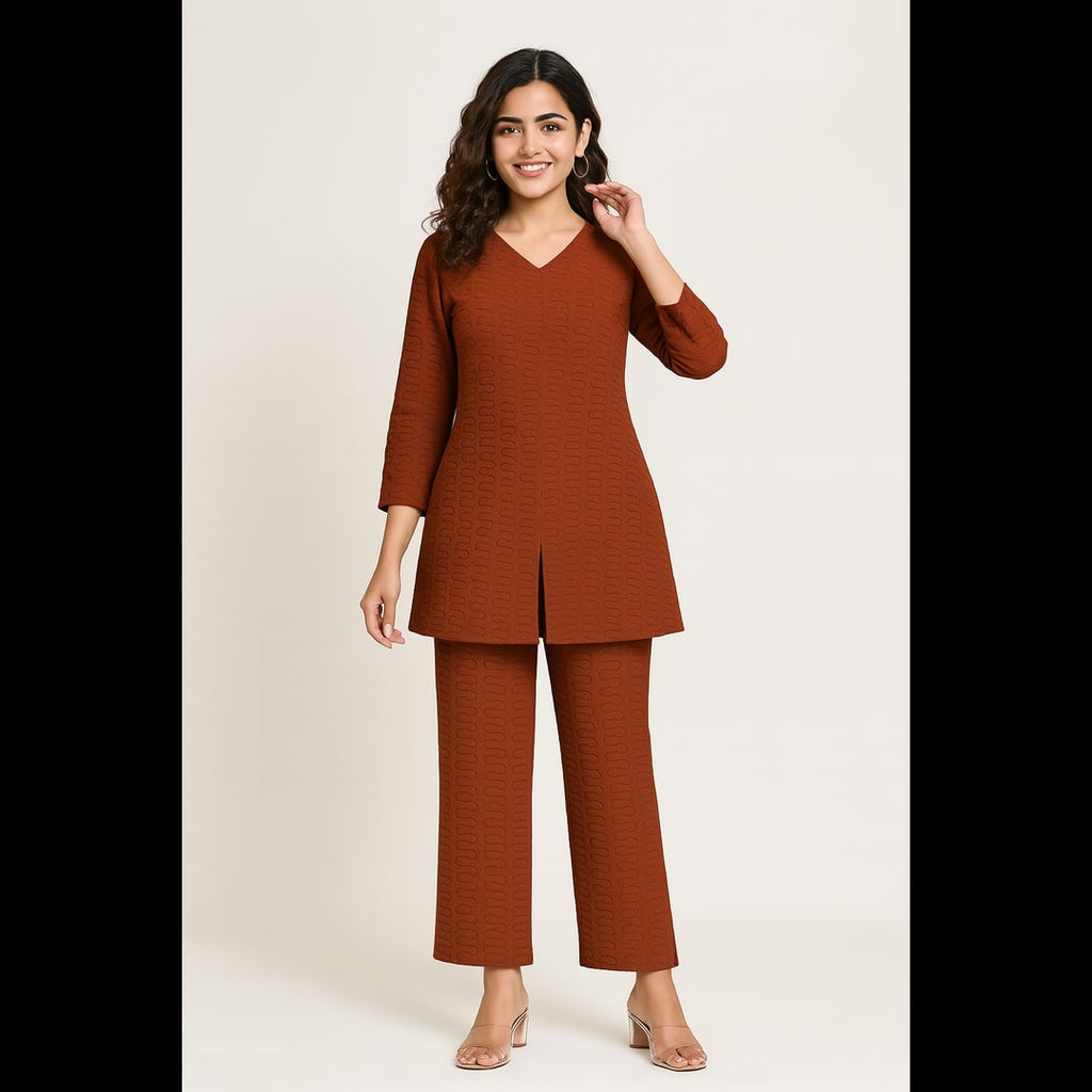 This relaxed-fit co-ord in deep sienna embossed cotton is your perfect blend of comfort and quiet sophistication. The gentle front slit and easy silhouette make it a go-to for breezy days and confident moments. Lightweight, breathable, and endlessly wearable.