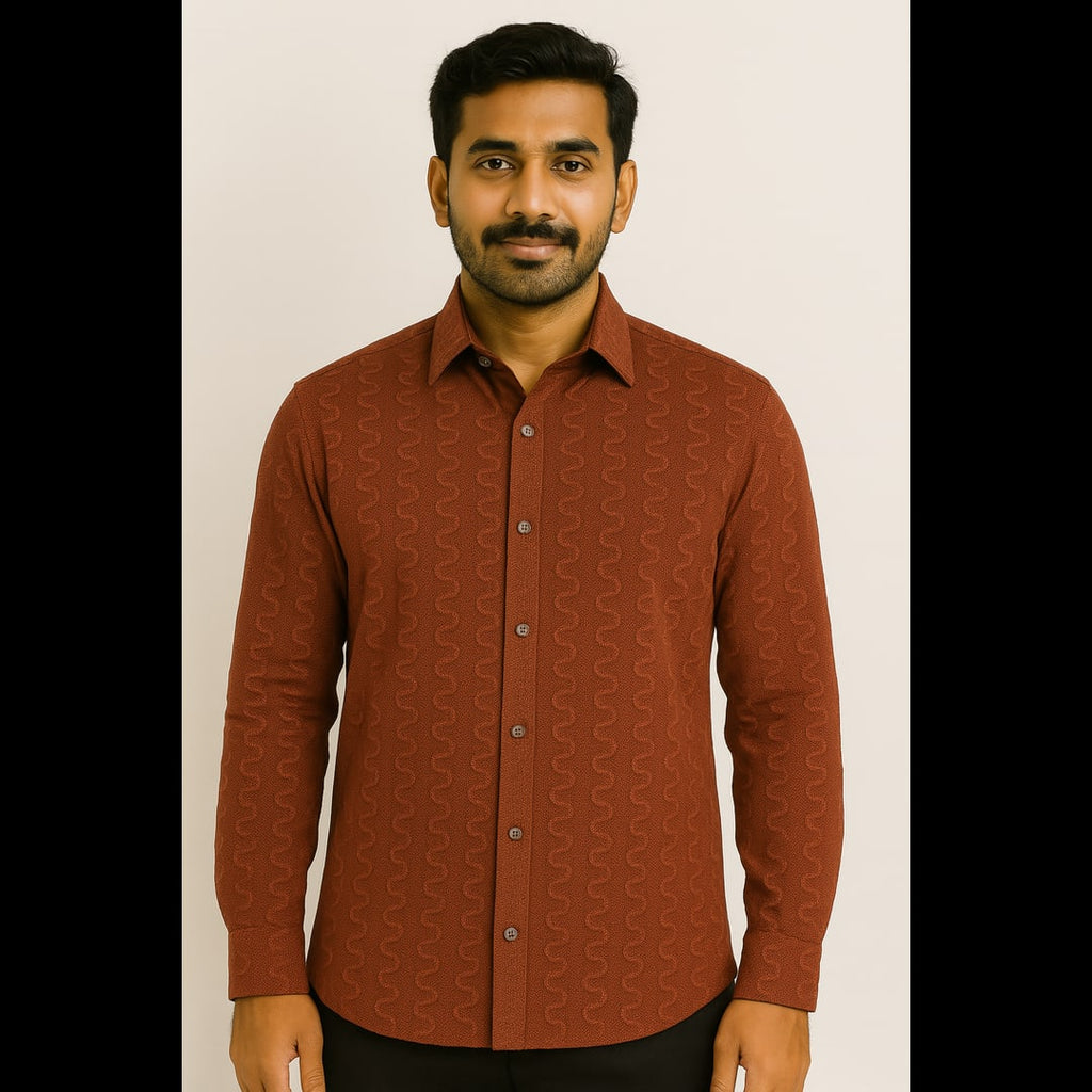 A sleek long-sleeve shirt crafted from embossed cotton, featuring a subtle wavy textured pattern throughout. Tailored fit with a sharp collar, perfect for both casual and formal occasions. The warm rust color adds a modern, earthy touch to any outfit.