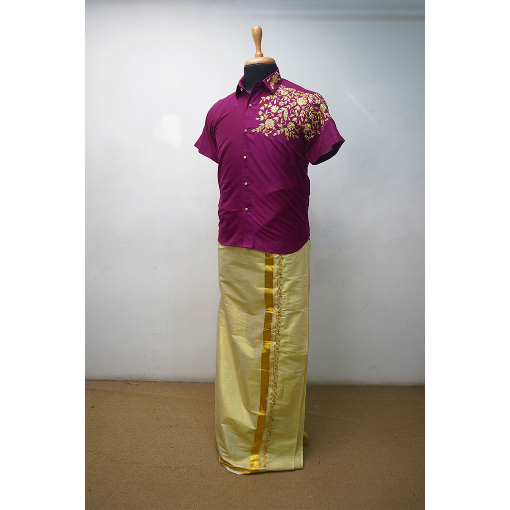The rich colour combination of maroon, mustard gold, and cream veshti tones gives a royal traditional look. Beautiful embroidery on the shoulder panel adds a premium, handcrafted touch while keeping the outfit comfortable and breathable.