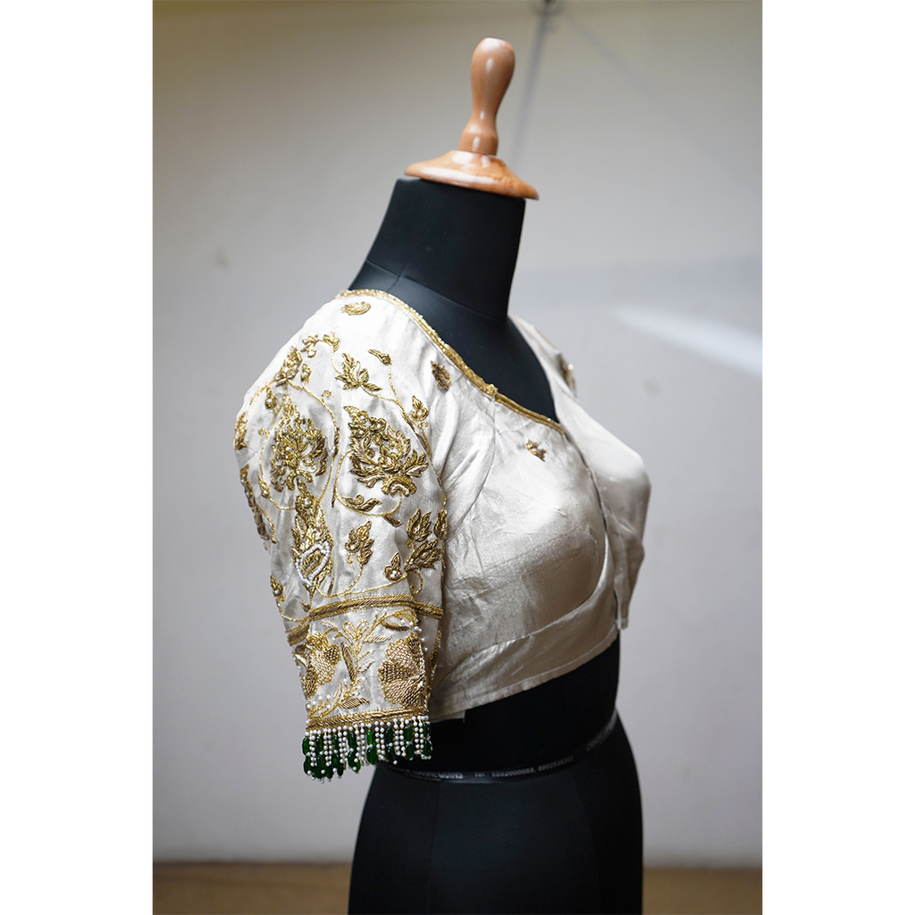 Elevate your traditional wardrobe with this luxurious ivory designer blouse crafted with intricate gold embroidery and sparkling beadwork. The highlight is its unique cut-out back design, adorned with cascading green beads that add elegance and festive charm. Perfect for weddings, receptions, engagements, and grand cultural events, this statement blouse pairs beautifully with silk sarees, organza drapes, lehengas, and designer skirts.