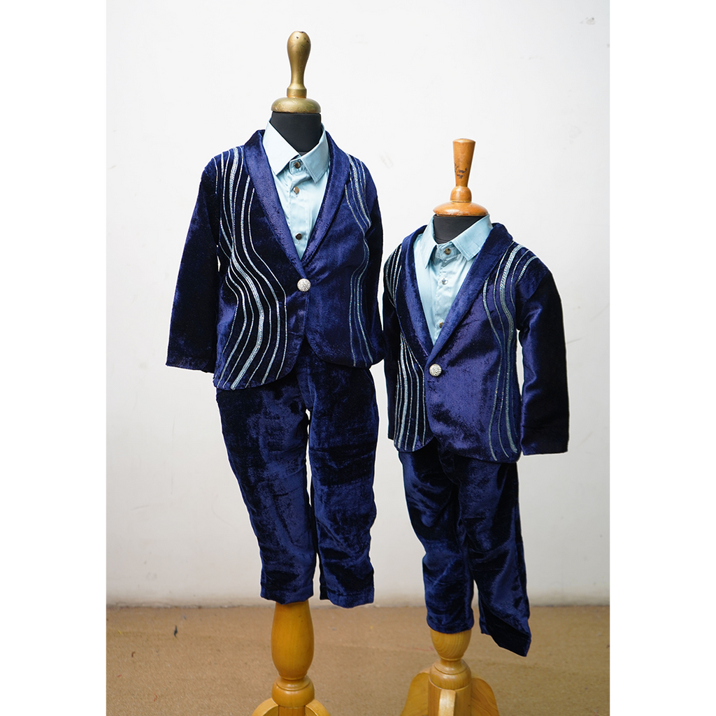 Premium velvet blazer with stylish silver line detailing, soft shirt inside, matching bow tie, and velvet trousers for an adorable gentleman look.