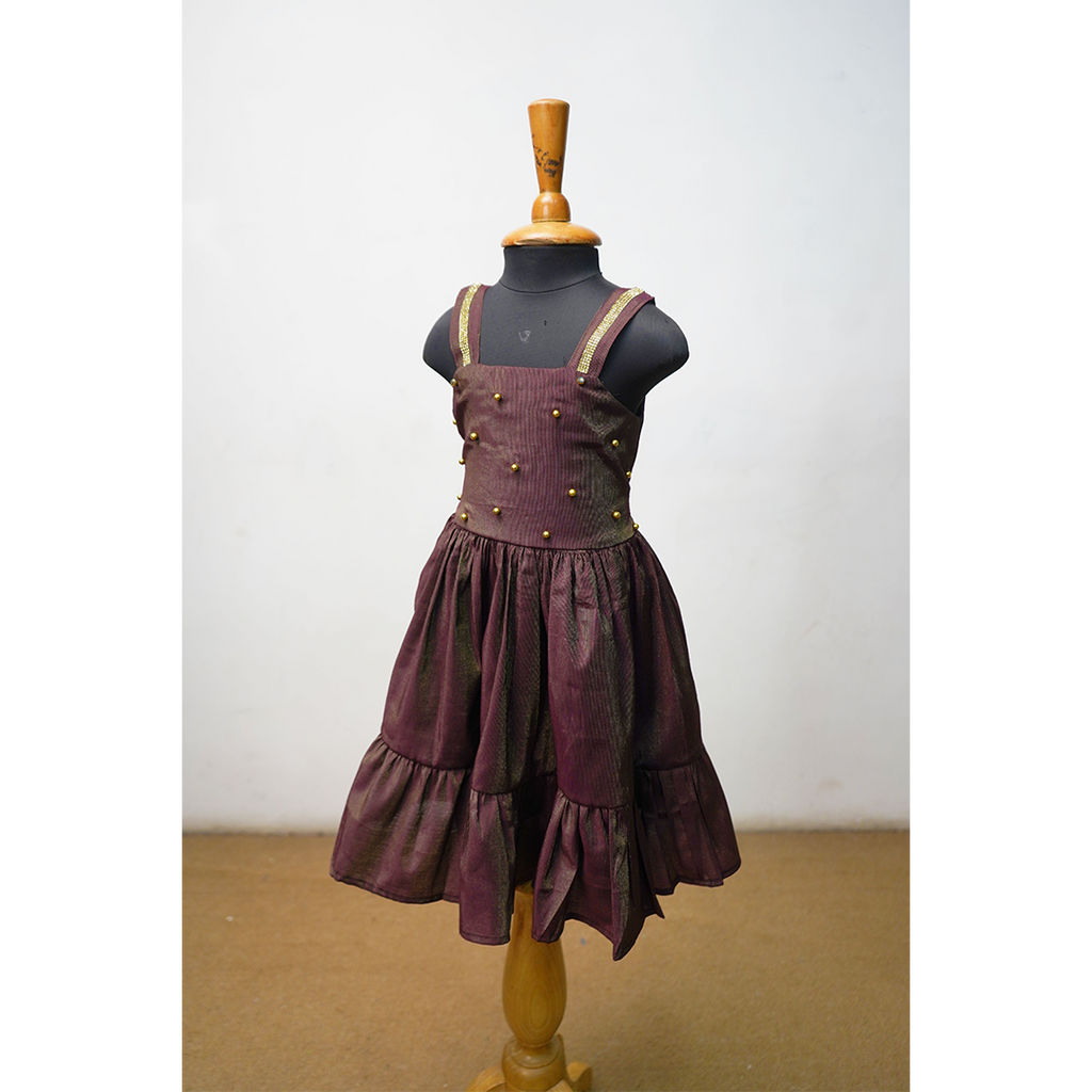 A stylish flared frock with pearl embellishments and tiered ruffles, designed to make your little one look adorable and festive.