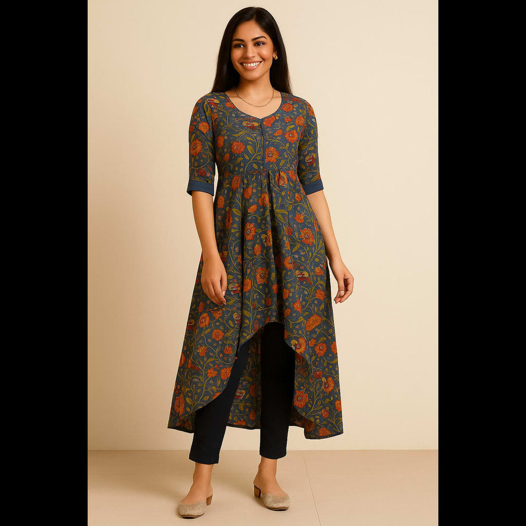 Crafted in poly-tussar, this kurta features a high-low hem and a flared empire waist, blending comfort with contemporary charm.