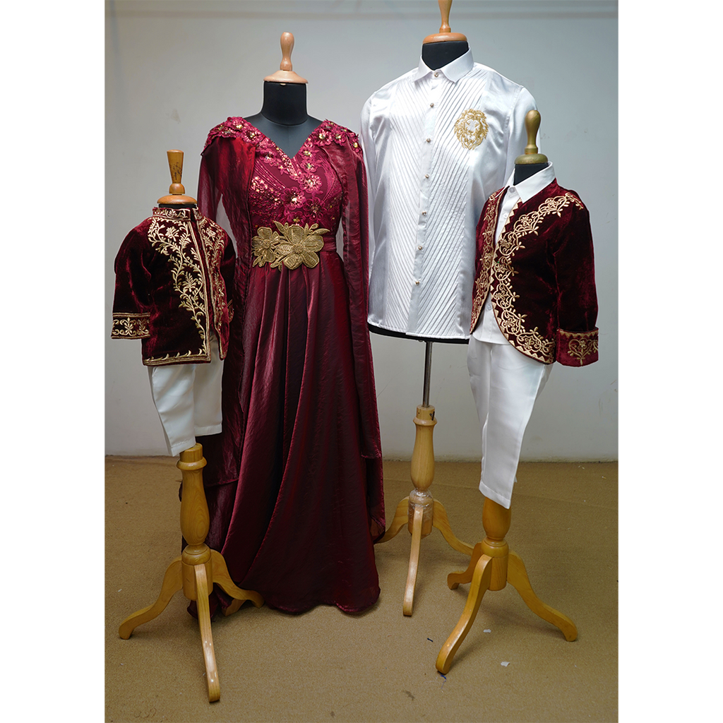 Royal Maroon & White Family Matching Ethnic Outfit Set Festive Couple & Kids Coordinated Dress Velvet Jacket Kids Set & Embroidered Gown Combo