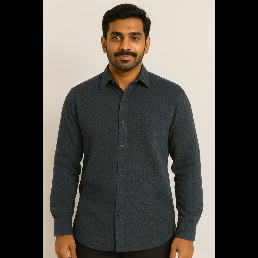Crafted from soft embossed cotton, this long-sleeve shirt features a subtle wavy texture throughout the fabric. Its deep ink hue and tailored fit offer a polished, versatile look ideal for both casual and formal occasions.